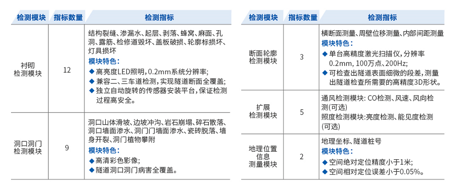 可对隧道洞口、洞门、裂缝类、渗漏水、起层、剥落、检修道等病害进行快速检测。