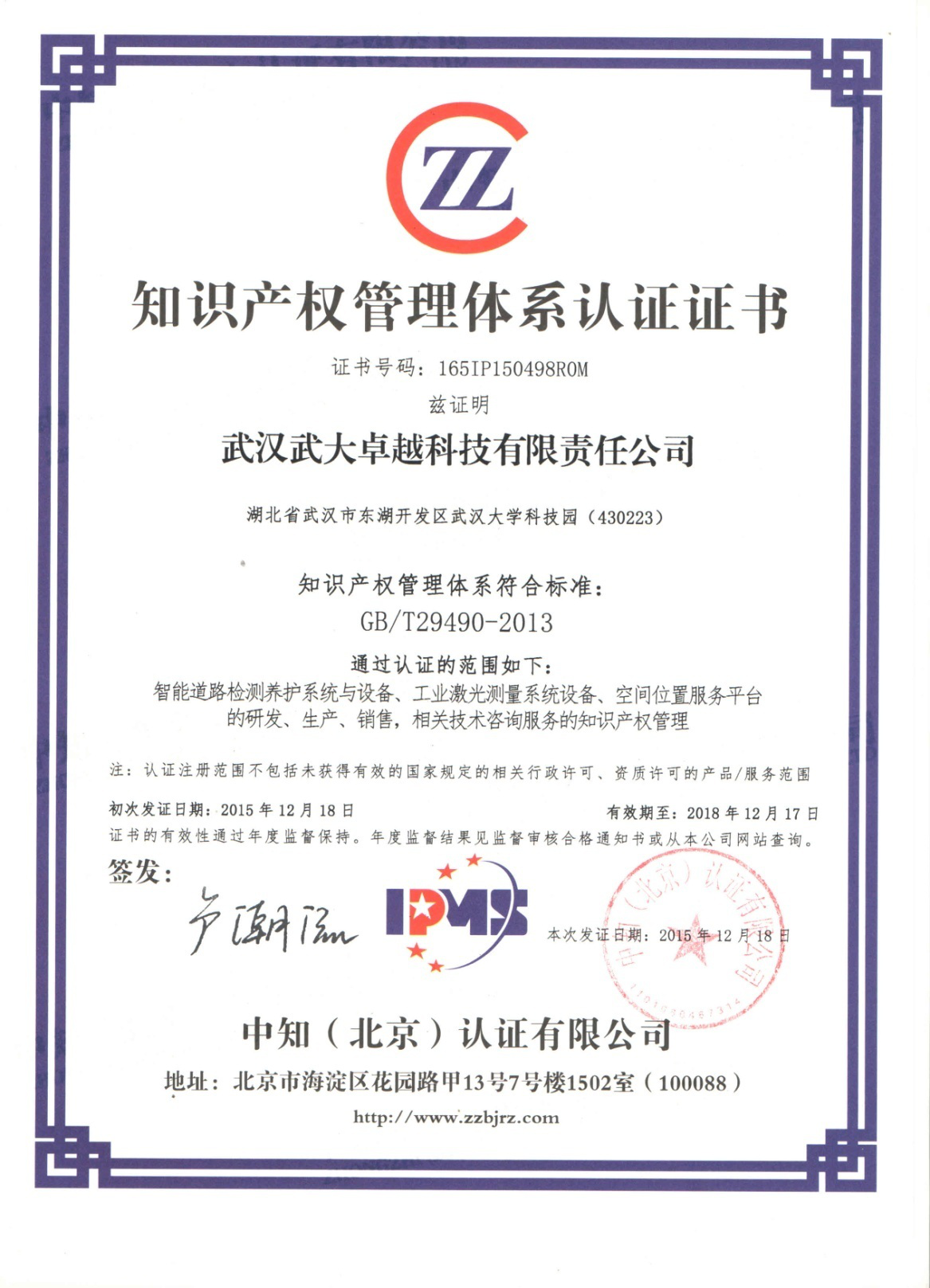 评审组对我公司近两年来持续贯彻落实《企业知识产权管理规范》所做出的工作给予充分肯定。2015年12月18日,卓越科技顺利获得了由中知(北京认证有限公司颁发的知识产权管理体系认证证书,成为全国首批通过《企业知识产权管理规范》认证企业。