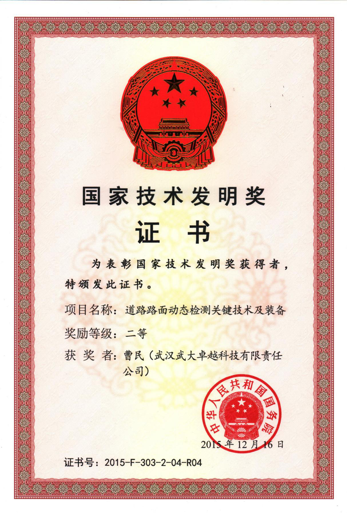 图为卓越科技董事长兼总裁曹民先生获得的国家技术发明奖证书