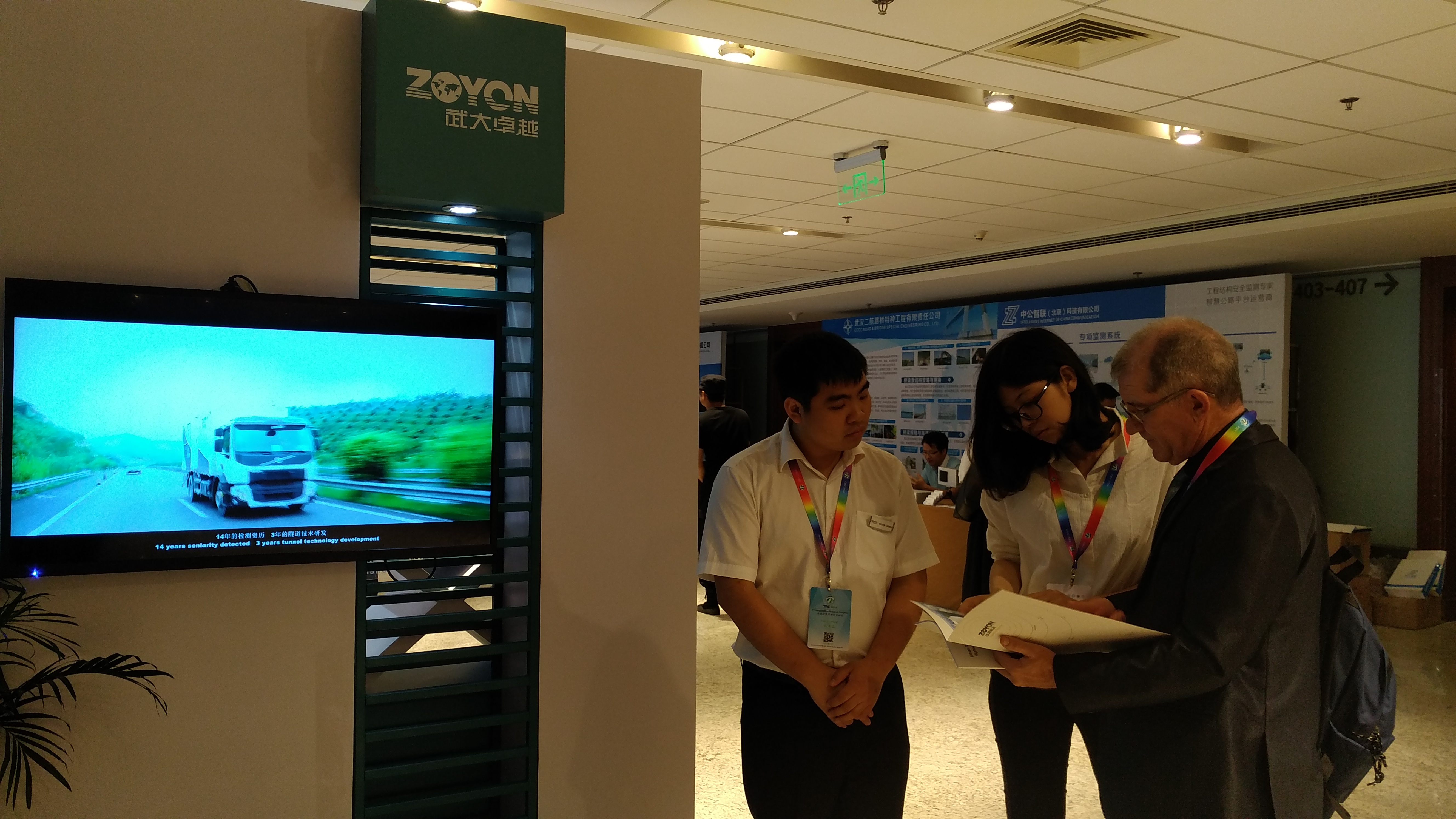 展示过程中,卓越科技展台备受国内外行业专家关注,参会人员纷至沓来。作为国内公路信息化整体解决方案提供商的企业,卓越科技展出的路况三维快速检测系统及隧道快速测量系统成为峰会亮点。其中,南非公路行业专家,美国TRB主办方及其他国外专家纷纷莅临卓越科技展台并进行了亲切地交流。