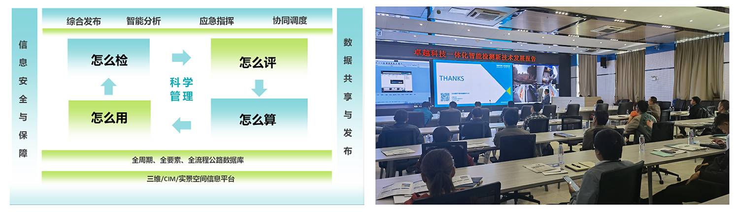 卓越科技董事长曹民在会上详细介绍了以三维、CIM、实景空间信息为平台的智能检测新技术,及全周期、全要素、全流程的公路数据库的一体化服务,为客户一站式解决怎么检、怎么评、怎么算、怎么用;卓越科技一体化智能检测新技术为客户实现“检”、“评”、“管”、“养”的信息化、智能化、科学化。