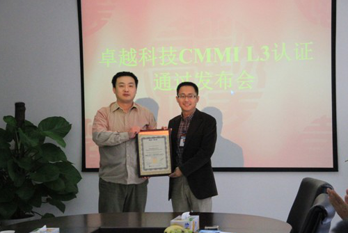2011年9月21日上午10点,在卓越科技二楼会议室举行的CMMI 3级认证通过发布会上,由美国SEI授权的主任评估师刘海笑郑重宣布:经过严格的现场审核和评估,卓越科技已经达成了CMMI3级的目标,成功通过CMMI3级认证!